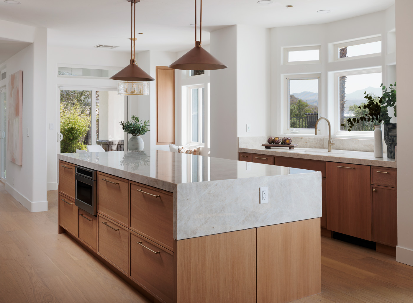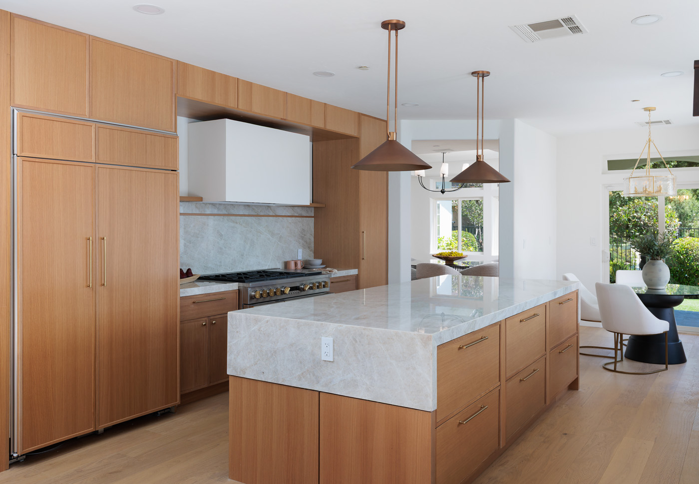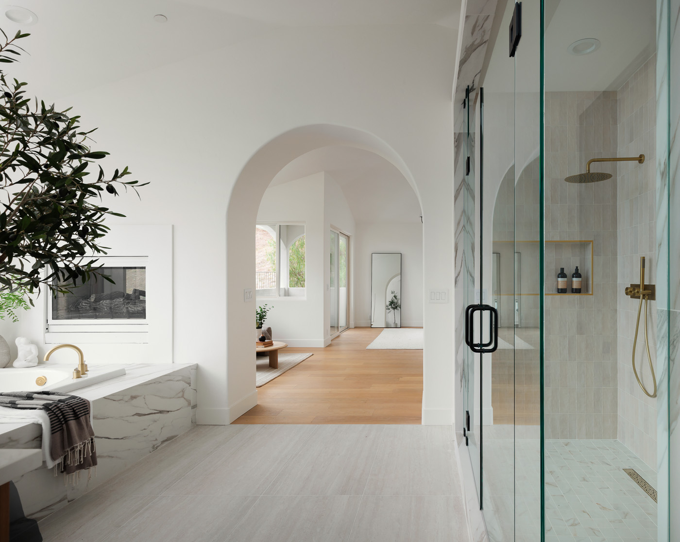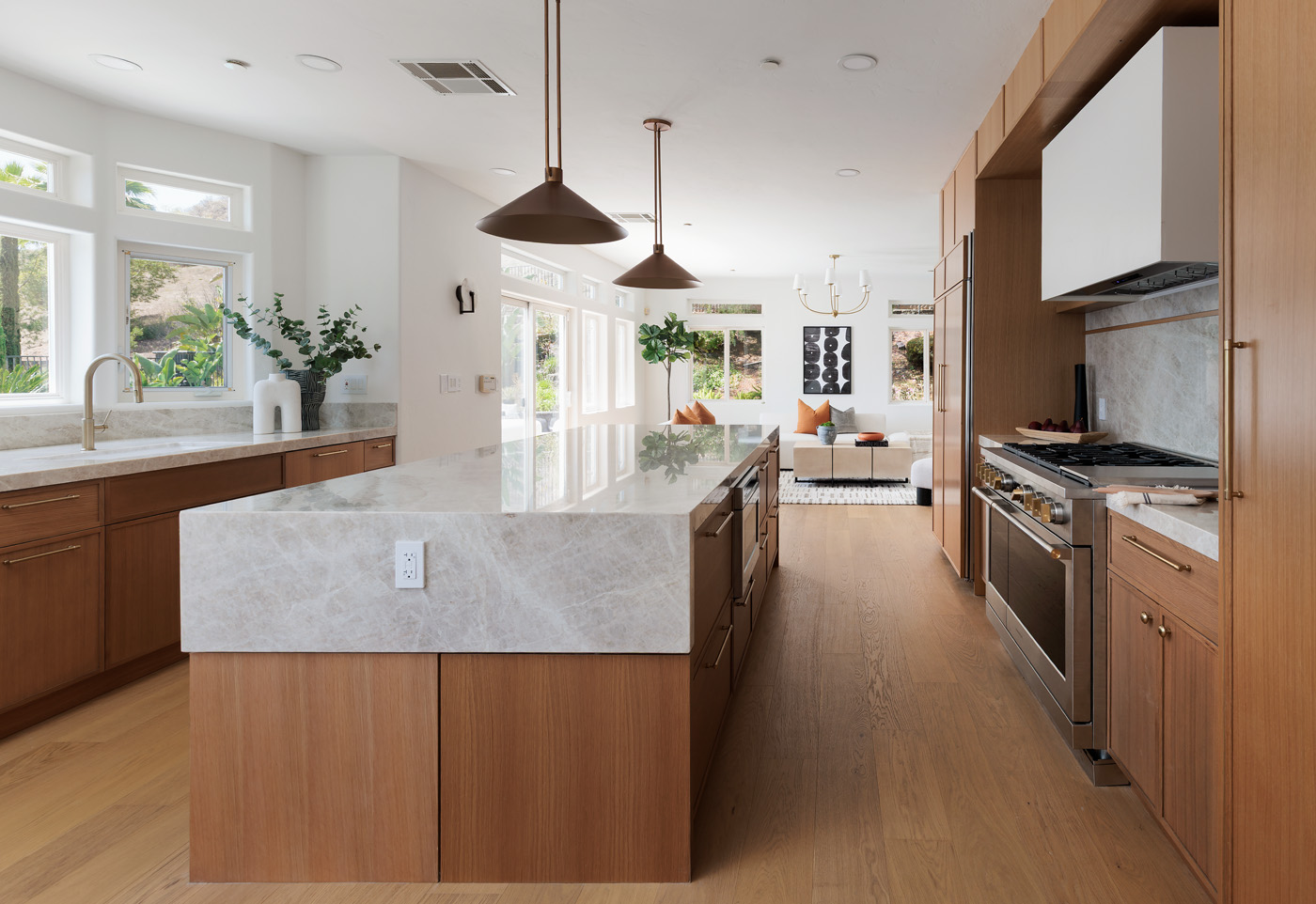This 1996, 4,200-square-foot home needed a fresh touch and repairs throughout. The new design transformed it from a dated Spanish style into a warm transitional-modern masterpiece. Carpet and vinyl flooring were replaced with beautiful light hardwood, and all cabinetry was rebuilt in oak with natural Taj Mahal stone countertops. The old bar room was reimagined as a modern wine cellar, and every bathroom was redesigned into a sleek, contemporary space with a luxurious feel. High ceilings, abundant natural light, and organic materials throughout the home create a perfect balance of comfort and modern elegance—an ideal place to live.